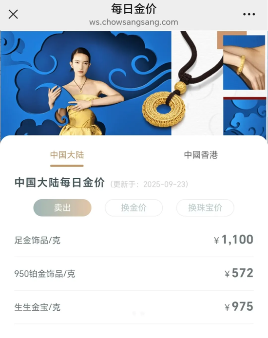 随着国际黄金价格走高,国内金饰价格上涨。9月23日,周生生足金首饰价格达到1100元/克,比前一日上涨10元/克;周大福和老凤祥足金首饰升至1098元/克。